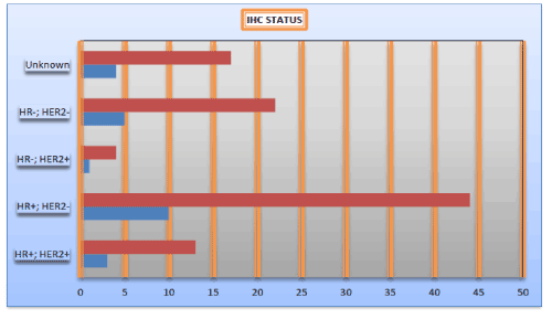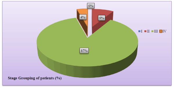 The prevalence of male breast cancer increases with age, and it is rare before the age of 30 years. The most common age group in the study group was 50-59 years (52%). The median age was 56 years at the time of diagnosis. Most of the studies has concluded that male breast cancer was diagnosed in elderly usually at 6th-7th decades of life [2,3]. In our study, most of the patients presented with right breast cancer unlike other studies which showed predilection for left breast. No bilateral breast carcinoma in the study group and all the patients were exclusively IDC. In the study group, hormone receptor positivity (57%) is much higher than the female counterparts and is in accordance with other studies [4]. As per the study, TNBC in men is lower compared to the female counterparts. Distant metastasis observed in patients with higher grade and advanced stages.