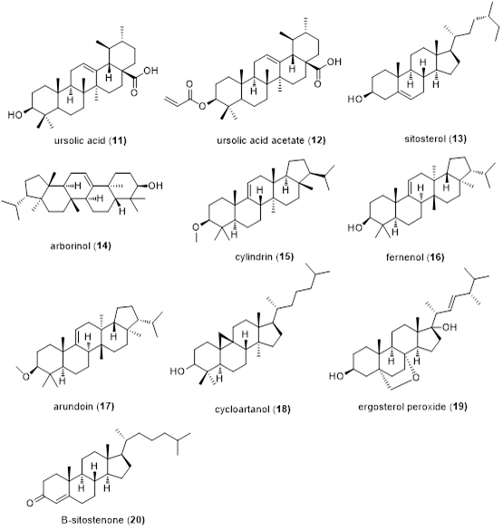 Saeed et al. isolated ursolic acid (11), ursolic acid acetate (12) and sitosterol (13) from the leaves of Areca catechu L. [8], and isolated arborinol (14), cylindrin (15), fernenol (16) and arundoin (17) from the peel [9]. Yang et al. isolated cycloatanol (18), ergosterol peroxide (19) and B-sitostenone (20) from its seeds (Figure 3) [5].