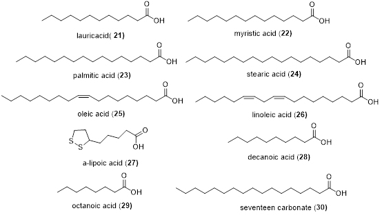 The fatty acids were mainly contained in the seeds of Areca catechu L., and the total content of fatty acid is about 14%. The lauric acid (21), myristic acid (22), palmitic acid (23), stearic acid (24), oleic acid (25), linoleic acid (26), α-lipoic acid (27), decanoic acid (28), decanoic acid (29) and seventeen carbonate (30) have been identified (Figure 4) [10].