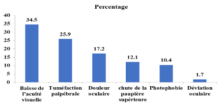 The main identified annoyances ranged from decreased visual acuity to palpebral tumefaction in 34.5% and 29.4%, respectively. This palpebral tumefaction is often post traumatic. For Handor et al. [5] in Morocco in 2014, aesthetic discomfort was the most reported in 65.9% of cases.