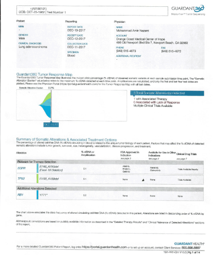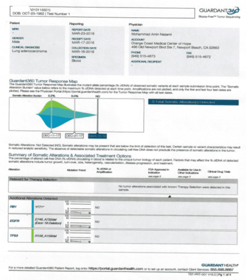 Our initial labs confirmed the presence of EGFR mutation at T790 M, as well as increased CYFRA 21.1 and IGF-1. Immediately she was started on IV epigenetic therapies per MTET protocol, which she received on daily basis for two weeks. Her labs further were repeated on March 9th, which showed reduction of her circulating DNA MAF (mutation allele fraction) from 31 percent down to 5 percent in her EGFR. (plus, APC, Kit, BRAF, MET alteration reduced or disappeared). Her blood test also confirmed reduction of her ALK-P, CRP and LDH. (normalized) Her IGF-1 also normalized at 118 (on 3/9/18) (Figure 1).