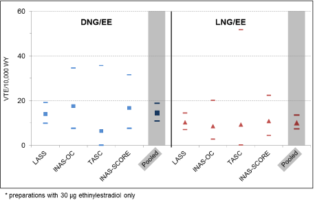 Methods: All four studies were prospective, observational cohort studies. Cohorts consisted of new users of hormonal contraceptives: starters, switchers and restarters. Study participants were followed up for up to 10 years. The analysis was restricted to preparations containing 30 μg of ethinylestradiol. Primary risk measure: VTE hazard ratio (HR) in the European study population for DNG/EE versus LNG/EE adjusted for age, BMI, duration of current use, family history of VTE and data source.