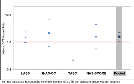 Figure 2. VTE hazard ratios and 95% CI for the individual studies and the pooled dataset: DNG/EE versus LNG/EE