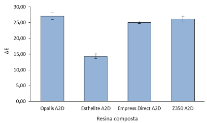The four resins presented mean ΔE significantly higher than zero (vita A2 scale), p <0.05, table 1 and figure 2. The Estelite A2D resin presented significantly lower mean ΔE than the others (p <0.05) and the Opallis A2D and Z350 A2D resins presented significantly higher mean values than the others (p <0.05).