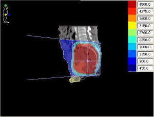 In addition, reducing the dose to the testicles leads to an increase in dose to the small bowel. The difference between the two plans indicates an increase in dose to the small bowel of up to 15%. Within the target volume bounded with three fields there is no difference in dose greater than 5% Figure 5.
