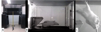 Figure 3. Sciatic functional index (SFI): (A) acrylic box for walk test; (B) Capture motion made by mobile phone using Image J Software; (C) rat print showing the measurements taken: ITS (intermediary toe spreading), TS (toe spreading), PL (print length).