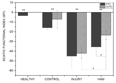 Figure 4. Sciatic Functional Index (SFI) columns for health, control, injury, HAM-0, and HAM-8 groups 5 and 12 days after SCI surgery. * p < 0.05, **p < 0.001. HAM (Human amniotic membrane), PO (Post-operatory).