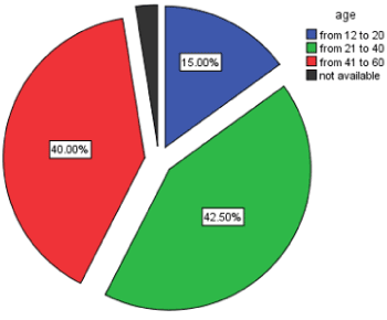 Age: The table below shows the distribution of the study sample according to age. Study Population can be divided into age groups:15% between 12 and 20 years, 42.5% between 21 and 40 years and 40% between 41 and 60 years, as also shown in (Figure 1) and (Table 1).