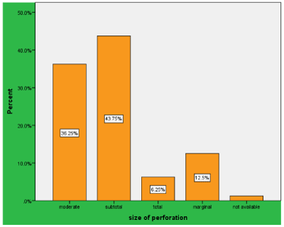 Size of Perforation: Table 3 shows the distribution of the study sample according to the size of perforation, we noticed that 36.3% of the study sample had a moderate perforation size, 43.8% were subtotal, while 12.5% of the study sample had a marginal size of perforation while only 6.3% of the study sample has a total perforation as also shown in Figure 2.