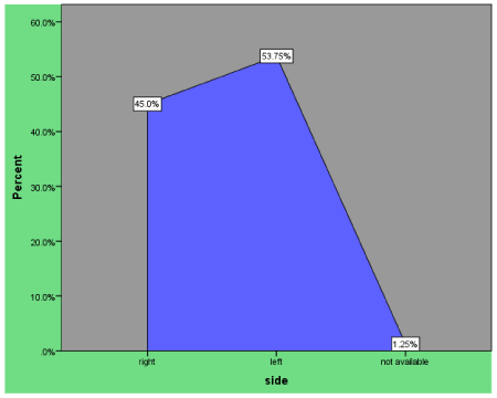 Side of the Perforation: 45% of the study sample had perforation on the right side while 53.8% had a left perforation as shown in Table 4 and Figure 3.