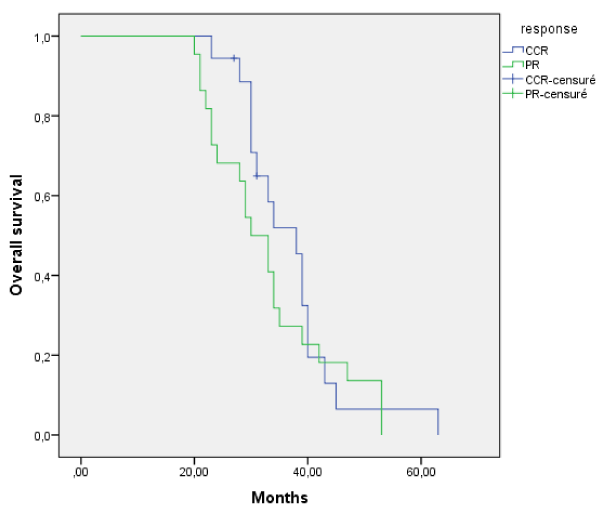 There was no benefit of overall survival in the CCR group compared to PR (p=0.391). Comparison of OS between complete clinical response and partial response groups is showed in Figure 1.