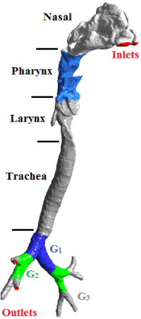 By considering the nose as the entrance for air and also defining eight different surfaces in the third generation of the lungs for the outlet of air, a realistic geometric model of the human respiratory system was developed. As it can be seen in Figure 2, different parts of the respiratory system have been shown with distinct colors.