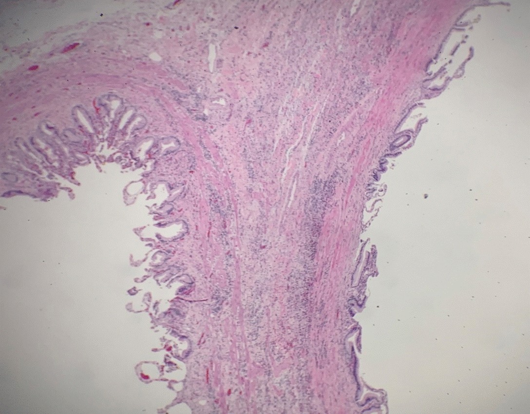 We received the specimen at the Pathology Department in a formalin fixed specimen container and designated as “gallbladder”. The specimen is a 10.5 x 4.2 x 3.5 cm bilobed gallbladder with a single cystic duct. The accessory lobe measures 8 x 2.5 x 1 cm. The specimen contains a copious amount of yellow, opaque bile with numerous (>25) yellow, multifaced choleliths ranging from 0.2 to 1.5 cm in size, in both lumens but predominantly within the accessory lobe. A 0.4 cm in thickness septum completely separates the two lobes of the gallbladder. The mucosa of the main lobe appears tan-pink and smooth; however, the mucosa of the accessory lobe is bile-stained green, with diffuse yellow stippling (Figures 1 and 2). Representative sections were obtained and the pathology report was consistent with a congenital bilobed gallbladder with acute cholecystitis superimposed on chronic cholecystitis and cholelithiasis (Figures 3 and 4).