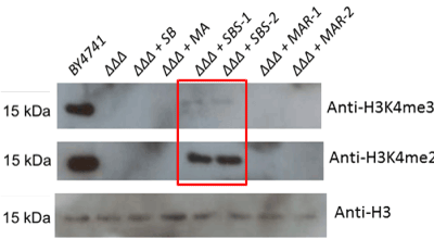 Overnight 5 mL yeast cultures of indicated strains were grown to an ocular density (OD) of 1.5 at 600 nm and subsequently harvested via centrifugation. Pellets were then frozen on dry ice and lysed with 10 M NaOH and 7.4% Betamercaptoethanol. 50% Trichloroacetic Acid was added as previously described [34], cells were washed with Tris and resuspended in 5X SDS buffer. Samples were then loaded on 4-12% NuPAGE Bis-Tris gels (Invitrogen), transferred to PVDF membranes, and then subjected to Western blot analysis using antibodies against histone H3 (Active Motif 61475) acting as a control, H3K4me1, H3K4me2 (Active Motif 39141), and H3K4me3 (Active Motif 39159).