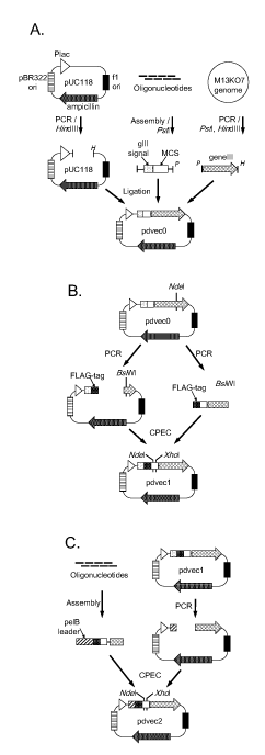 Figure 1. Schematic diagram of phage display vectors construction. (A) pdvec0 construction. A vector fragment of pUC118 was amplified by polymerase chain reaction (PCR) and digested with HindIII (H). Assembled oligonucleotides, containing gene III signal and multicloning site (MCS), were digested with PstI (P). The PCR-amplified gene III fragment was digested with PstI and HindIII. These three fragments were ligated to generate the pdvec0 vector. (B) pdvec1 construction. During the PCR of vector fragment, a FLAG-tag coding sequence was generated downstream of the gene III signal, and the NdeI restriction site in gene III was synonymously replaced by BsiWI restriction site. The margin sequences of FLAG-tag and gene III partial sequences were also generated at the terminals of the insert fragment by PCR. These two fragments were assembled by CPEC reaction. (C) pdvec2 construction. The assembled fragment contained a pelB leader sequence instead of a gene III signal sequence. The fragment was ligated with the digested vector by CPEC reaction. Both pdvec1 and pdvec2 have unique NdeI and XhoI restriction sites in the MCS.