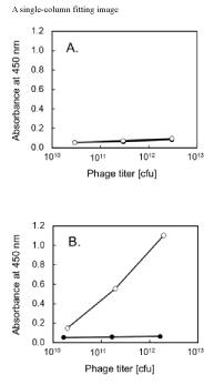 Standard phage sandwich ELISA was performed as follows. Monoclonal ANTI-FLAG M2 antibody (Sigma) was diluted in PBS, and 100 μL aliquot of the solution, containing 1 μg antibody, was dispensed to a microtiter plate (Immuno Module F8, Nunc). After incubation at 4°C overnight, each well was washed three times with PBS containing 0.05% (v/v) Tween 20 (PBS-T). Then, 200 μL of 3% (w/v) bovine serum albumin (BSA; Fraction V, Sigma) in PBS was dispensed and incubated for 1 h at 37 °C for blocking. After blocking, each well was washed three times with PBS-T, and the phage solution diluted in PBS with 1% (w/v) of skimmed milk (MPBS) was added. The strip was incubated for 1 h at 37°C and washed three times with PBS-T. MPBS (100 μL) containing peroxidase-conjugated anti-M13, Fd, F1 filamentous phages (PROGEN Biotechnik, Germany) was added to each well, incubated for 1 h at 37°C, and washed three times with PBS-T. Then, 100 μL of 3,3′,5,5′-tetramethylbenzidine (TMB) solution (1-Step Ultra TMB-ELISA Substrate Solution, Thermo Fisher Scientific) was dispensed to each well and incubated for 30 min in the dark. The chromogenic reaction was stopped by addition of 100 μL of 1 M H2SO4, and the absorbance was measured at 450 nm on a microtiter plate reader (Viento XS, DS Pharma Biomedical, Japan).