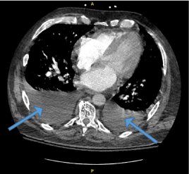 Figure  1.  CT chest demonstrating moderate  bilateral pleural effusion suggestive of mild CHF (blue arrows)