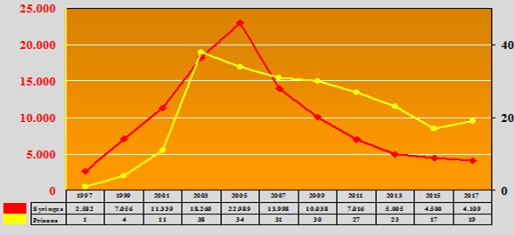 Regarding the number of prisons with needle exchange programs as well as the total number of needles provided, the curve shows three different zones: one representing the first years after implementation, with a slow beginning, a second one with an exponential increase in the number of facilities which implement the program after the publication of the order that compelled all prisons to do so, and a third one representing the maintenance of the number of prisons in the last years. The number of needles provided progressively increased until 2005 when it slowly started to fall. In the last years we have observed a reduction of the number of users of harm reduction programs which is partially due to the modification of consumption habits and the proportional reduction of drug users among prisoners. The implementation of health education programs and the preparation of mediator programs, which directly include prisoners as active health agents, also have been efficient in improving habits among prisoners, reducing injecting drug use and sharing needles [21] (Figure 6).