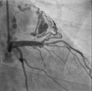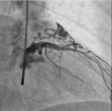 A 59-year-old man presented to the outpatient clinic of cardiology department with recurrent chest pain for several weeks. An electrocardiogram showed sinus rhythm with T wave inversion in leads V2 through V6, and appearance suggestive of anterior-wall ischemia (Figure 1). Two-dimensional transthoracic echocardiography showed no regional wall motion abnormality. Elective coronary angiography was performed. Very tortuous and dilated fistula track originated from left main stem linked to ‘heart-shaped’ small chamber and drained to right atrium on various projection views (Figures 2-4). He was referred for surgical obliteration of the fistula. After surgery, he suffered from postoperative myocardial infarction and heart failure. With ongoing medical conservative treatment, the chest pain and dyspnea resolved within 2 weeks, respectively and discharged. He was discovered with state of death in his home at follow-up 3 months later. The cause of death is not known but suggestive of sudden cardiac death. Perioperative myocardial infarction is an important complication of ligation of coronary artery fistula and could contribute to his sudden death.