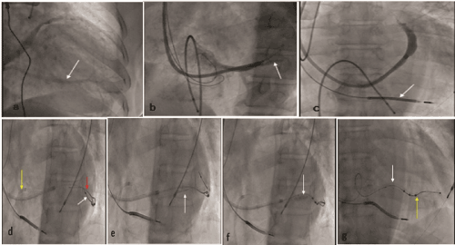 d. CS hooked with JR3.5 guide (yellow arrow) and CS tributary wired with SION BLUE wire (red); quadripolar LV lead is shown (white arrow)