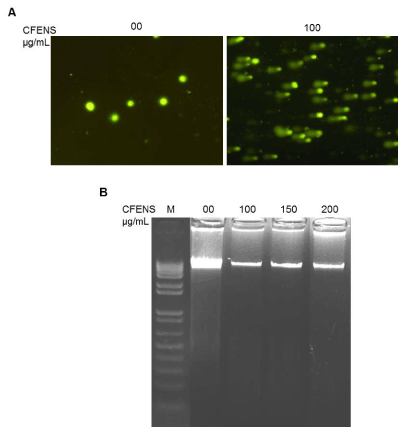 Figure 6. CFENS induces DNA damage lacking oligo-nucleosomal degradation. MCF-7 cells were treated with the indicated concentration of CFENS for 48 h; then harvested and assayed (A) Comet assay showing DNA damage in MCF-7 6 cells treated with CFENS; magnification 10X. Notice treated cells show clear appearance of a fan like comet formation, which is a typical characteristic of apoptotic phenomenon; (B) Agarose gel electrophoresis shows CFENS treatment did not induce oligo-nucleosomal degradation of the genomic DNA. Lane `M’ indicates the DNA marker ladder.
