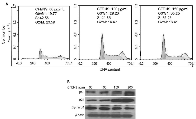 Figure 7. CFENS induces cell cycle arrest and modulates expression of cell cycle-regulating proteins in MCF-7 cells. (A) CFENS induces G1/G0 phase arrest Cells were incubated with the displayed concentrations of CFENS for 24 h, harvested, labelled with propidium iodide and analyzed by flow cytometry. (B) The MCF-7 cells were incubated with the indicated concentrations of the CFENS for 24 h; then total protein lysates were prepared and subjected for Western analyses. CFENS treatments modulate up-regulated expression of p53 and p21 proteins and down-regulated expression of cyclin D1 protein. The experiments were repeated several times and typical results from independent experiments are shown.