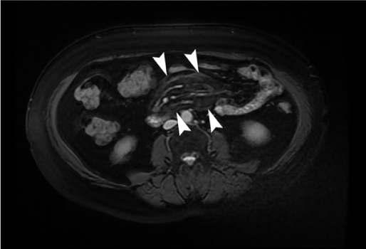 Figure 5. On axial contrast–enhanced MR image, multiple mesenteric lymph nodes and preservation of fat around vessels and lymph nodes (fat ring sign, arrow) were seen in the hyperintense fatty mass.