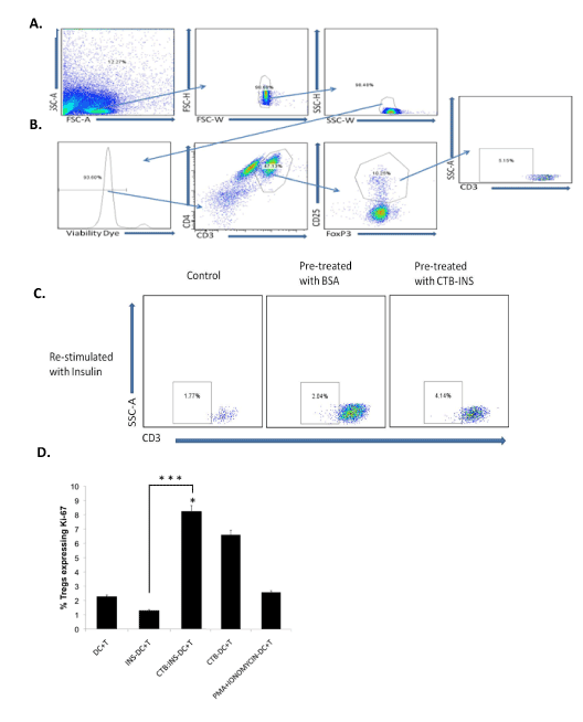 Because Treg cell differentiation and proliferation is often slower than observed for other T cell subsets, an experimental protocol was adopted to allow detection of small Treg cell numbers [20,21]. The Tregs were identified based on priming immature DCs with specific antigens (insulin) that stimulate cognate Treg cell development. Insulin specific Tregs were identified by measurement of down-regulation of CD3/TCR complexes on the T cell surface following a boost with the specific antigen. Thus, the protocol was optimized to allow detection of relatively infrequent Tregs specific for T1D autoantigens. Briefly, human peripheral blood mononuclear cells (PBMC) were separated from RBCs by RBC lysis. The lymphocytes, iDCs and naïve T cells were re-suspended at a concentration of 2.5 - 3.5 x 107 PBMCs / ml. Aliquots (200 µl), of the PBMC suspension were dispensed into triplicate wells of a 24-well plate and incubated with CTB-INS fusion protein (1 x 10-5 M final CTB-INS concentration), for 1 hour at 370C and 5% CO2. The cultures were diluted 10-fold (2.0 ml) with RPMI complete medium containing IL-2 (300 U/ml) and incubated at 370C for 14-28 days for Treg amplification. During this period, the cultures were fed at 2-3-day intervals using complete RPMI medium supplemented with IL-2 for optimal expansion of antigen-specific Tregs and split as required, taking care to maintain a high cell density (1.5-2.5 x 106 cells/ml. Following the 2-3 wk extended culture, antigen-specific Tregs were detected by incubating a maximum of 1x106 cells at 370C in 100 µl of fresh medium containing proinsulin at 1x10-4 M for 16 hr. The insulin boosted cells were then stained for T cell markers CD3+, CD4+, and Treg activation markers CD25+, CD127+ and FoxP3+ and analyzed by flow cytometry by gating on viable CD4+, CD3low T cells. T cell proliferation was assessed by flow cytometric detection of intracellular Ki-67. The DC-T co-cultured cell samples were harvested as described above and surface stained for T cell markers CD3+, CD4+, CD25+ and CD127+. [20]. To identify native Tregs, intracellular staining for the transcriptional activator Foxp3+ in place of CD127 was also carried out.