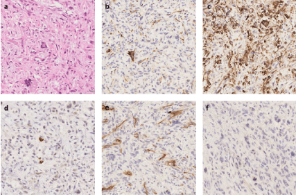 Figure 1. Pheumectomy pathology images. a. Hematoxylin and eosin (HE) stain showing pleomorphic spindle cell proliferation (x200) b. Immunohistochemistry (IHC) showing partial desmin positivity (x200). c. IHC showing SMA positivity (x200). d. IHC showing partial MDM2 positivity (x200). e. IHC showing CD34 negativity (x200). f. IHC showing p63 negativity (x200)