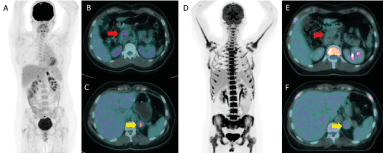 Figure 2. 18F-FDG PET/CT before (A-B-C) and after (D-E-F) chemotherapy. Complete metabolic response of the pancreatic lesion (red arrow) and partial metabolic response of the left adrenal lesion (yellow arrow)