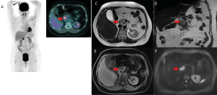 Figure 3. 18F-FDG PET/CT (A-B) and MRI (C-D-E-F) for the diagnosis of the isolated pancreatic relapse. Solitary pancreatic mass associated with a high hypermetabolism on !8F-FDG PET/CT (SUVmax 11.4) and on MRI 3.5cm mass at the head of the pancreas with a hypersignal on axial (C) and coronal(D) T2-weighted MRI without compression on biliary or wirsung duct. This mass appeared as hypo-intense on unenhenced T1-weighted MRI (E) with significant restriction of diffusion at b800 (F). (red arrow)