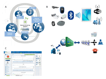 Figure 5. Telemedicine project: DIABETe. A: DIABETe is based on a smart system comprising an inference engine and a medical ontology for personalized synchronous or asynchronous analysis of data specific to each patient and, if necessary, the sending of an artificial intelligence-generated alert (MyPrediTM. B: The platform comprises connected nonintrusive medical sensors, a touchscreen tablet connected by Wi-Fi, and a router or 3G/4G, rendering it possible to interact with the patient and provide education on treatment, diet, and lifestyle. C: The system involves a server that hosts the patient’s data and a secure internet portal to which the patient and hospital- and non-hospital-based healthcare professionals can connect