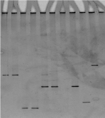Figure 3. DGGE of ovine, caprine, bovine and avian mycoplasma controls: lanes 1, 2 : M. agalactiae, lanes 3, 4: M. bovis; lanes 5, 6: M. mycoides, lanes 7, 8: M. gallisepticum, lanes 9, 10: M. synoviae,, lanes 11, 12: M. gallinaceum, lanes 11, 12: M. gallinarum, lanes 13, 14: M. meleagridis.
