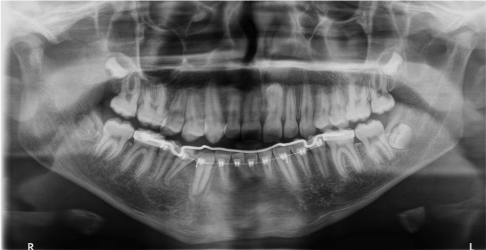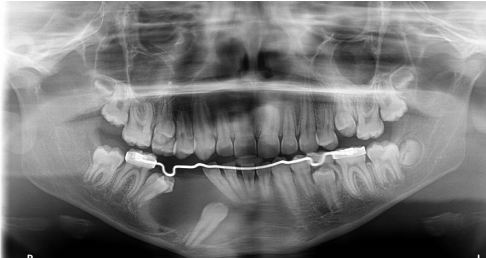 After the eruption of the involved teeth and in order to check the progress, another ortopantomography was performed. No cyst lesion was observed (Figure 12).