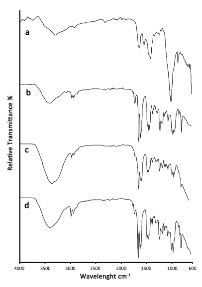 The adhesive spectrum (b) showed peaks near 1700 cm−1 (C = O) and 1400 cm-1 (C = C) related to the acrylate functional group, C-H stretching vibrations near 2900 cm−1, and the presence of a band around 3400 cm-1 corresponding to the O-H bond of the isopropanol solvent but also the water solvent.