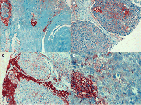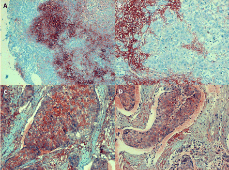 4D (in the right, line below): undifferentiated SCC from originating in the maxillary sinus shows invasive growth into a lymphatic vessel; granular staining of the IL-6 antigen can be seen in the cytoplasm of carcinoma cells and occasionally within the tumour stroma, magn. 240x