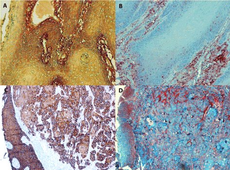 Sections from 21 tongue SCC samples present on the above-mentioned tissue array (HN801a) were alternatively stained by the HE procedure. In contrast, the sections of 34 HNSCC samples obtained from the collection of the Department of Pathology, St. Elisabeth Oncology Hospital in Bratislava, were stained not only with the anti-IL-6 specific serum, but also with specific antibody to cytokeratin 5/6 (CK5/6) and by the Masson´s trichrome stain (summarized in Table 1). In the former, altogether 9 differentiated carcinomas of grade I were found. The Figure 3 shows a case of conventional SCC grade I tongue tumour revealing squamous cells arranged into epithelial whorls; in this particular tumour, the IL-6 antigen could be seen mainly in the cytoplasm of dysplastic cells, which were located in parabasal layer, especially in the areas of proliferation growing into the underlying stroma and resembling finger like protrusions. In such cases, the fibroblasts in surrounding stroma were strongly positive along with the abundant extracellular IL-6 antigen deposits. In another differentiated carcinoma sample (classified as verrucous carcinoma, (Figure 3), some bands of proliferating cells showed dysplastic appearance especially at tumour margin.