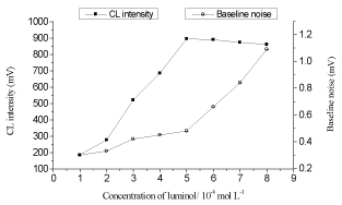 Keeping the K3Fe(CN)6] concentration at 4×10-4 mol L-1 and NaOH concentration at 0.2 mol L-1, the influence of luminol concentration on CL intensity was examined within the range of 1×10-4 -8×10-4 mol L-1 (shown in Figure 3). It is observed that the CL intensity was increased with increasing luminol concentration, and the CL intensity reached to the maximum at 5×10-4 mol L-1of luminol, when the concentration was greater than 5×10-4 mol L-1, the baseline became unstable and the signal to noise ratio decreased. Therefore, a 5×10-4 mol L-1 luminol solution was chosen as the optimum.