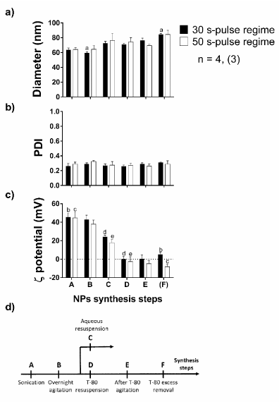 Figure 1. (a) Particle diameter, (b) PDI and (c) ζ potential in the synthesis characterization while comparing two different sonication regimes, one with five 30 s pulses and another with 50 s pulses. The sample size is 4 for most synthesis steps, with the exception of the last step, in which 3 replicates were executed. The two-way ANOVA was employed along with the Holm-Šídák test; and statistically significant comparisons at the 5 % level are marked by letters (a-e). (d) A fluxogram of the synthesis procedure of NPs is revealed, being A: post-sonication; B: after overnight agitation; C: after aqueous resuspension (control); D: after T-80 resuspension; E: after 1 h agitation in T-80 solution; F: after T-80 excess removal. pa, pb, pc< 0,0001; pd = 0,0055; pe = 0,0279.