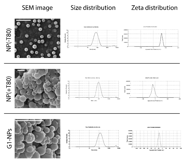 Figure 3.Comparison of empty NPs with or without being functionalized with T-80; and G1-NPs regarding their SEM morphology, size and ζ potential distributions. The scale bar refers to a real size of 1 µm.
