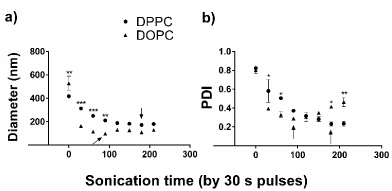 Figure4.DPPC-LPs and DOPC-LPs formation curves. Measurements of the vesicles (a) size and (b) PDI were taken. The arrows indicate in which time the size or PDI were considered optimum. The tests were conducted in duplicate (some of the errors are rather small in this scale). The two-way ANOVA with the multiple comparisons by the Holm-Šídák test were used to find statistical significance when comparing the PCs. *p < 0.05; **p < 0.01; ***p < 0.001 by each PC-time comparison.