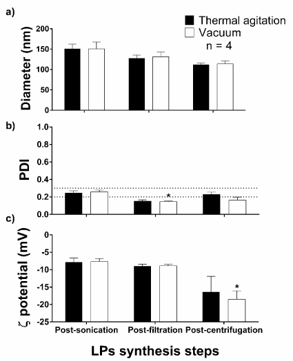 Figure 5.Analysis of different lipid film formation techniques om DPPC-LPs (a) diameter, (b) PDI and (c) ζ potential. The sample size is four and statistical analysis was done with the two-way ANOVA followed by the multiple comparisons Holm-Šídák test. *p < 0.05 when comparing the same post-sonication treatment group.