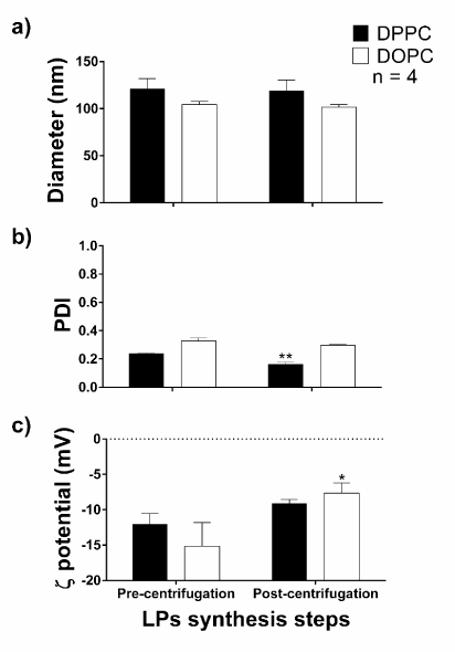 Figure6. Comparison between DPPC-LPs and DOPC-LPs after a less vigorous centrifugation. Measurements of the liposomes regarded their (a) diameter, (b) PDI and (c) ζ potential. The sample size is four and statistical analysis was done with the two-way ANOVA with the multiple comparisons by the Holm-Šídák test. *p < 0.05; **p < 0.01 when comparing the same PC.