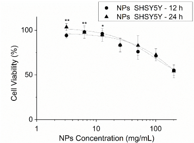 Figure8.Cytotoxic profile of nanoparticles in SHSY5Y cells. The graphs show both experimental points and pharmacological profile adjustments. The sample size was six (n = 6). Carriers were applied for either 12 h or 24 h. Statistical analysis was performed by two-way ANOVA and multiple comparisons by Holm-Šídák test. ** p < 0,01; *p < 0,05 in relation to the highest concentration of each time period.