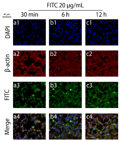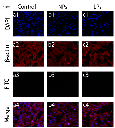 Figure 10.Immunofluorescence images for the internalization experiments regarding FITC-LPs and FITC-NPs, in which only a solution of FITC (20 µg/mL) was applied as a control. The frames numbered from 1-4 denote DAPI (1), β-actin (2) and FITC (3) and merge (4). The fluorescent particles were incubated for 30 min in (a), 6 h in (b) and 12 h in (c) with SHSY5Y cells.