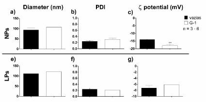 From the data collected (Table 5), G1-LPs showed a greater encapsulation efficiency then G1-NPs. In this case, we tried different initial drug masses for loading, in order to equalize the final drug mass in both systems, taking into account the encapsulation efficiency. Additionally, G1-LPs revealed to encapsulate in such amount, that we could not quantify one of our replicates. The physical properties, such as diameter, PDI and ζ potential of the G1-loaded carriers were also compared with the empty ones (Figure 12). G1-LPs did not differ from empty LPs in none of the investigated physical properties. G1-NPs are also similar to empty NPs in term of particles size and PDI. Nevertheless, G1-NPs possess a more negative ζ potential.