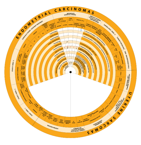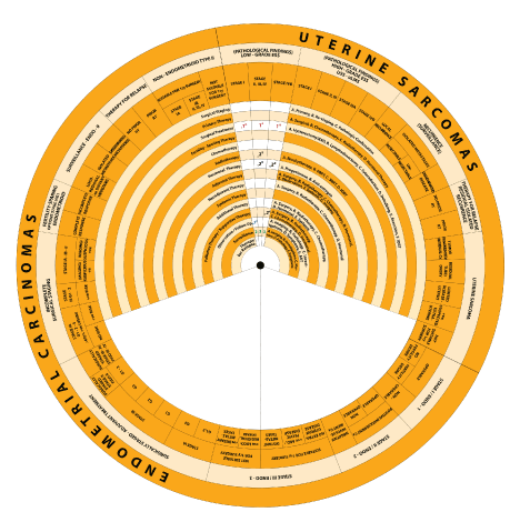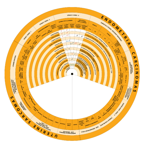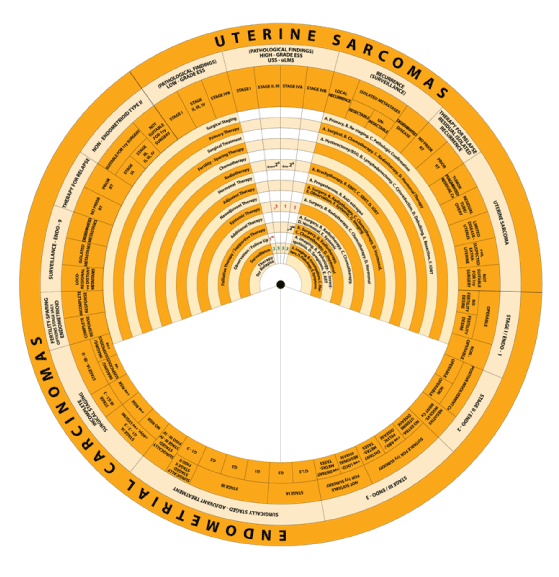 While defining the management of Endometrial Carcinomas and Sarcomas separately, it integrates recommendations from different guidelines addressing the management of uterine neoplasms. The wheel includes guidelines and algorithms (steps) for management of uterine neoplasms.