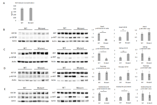 Figure 2. Female mice with the IGF1RhR407H genotype showed alterations in IGF1R expression levels. A. Serum IGF1 levels in female WT and IGF1RhR407H (mutant) mice at 6 months of age (n=4-5). B-E. Western blotting was performed to measure the phosphorylation levels of IGF1R, AKT and the total IGF1R expression in heart (B), kidney (C), pancreas (D), and skeletal muscle (E) tissues (n=4 mice per genotype). The phosphorylated to total protein ratios and IGF1R total protein expression, as determined by densitometry, are shown on the right (B-E). IGF1R expression levels were normalized to each individual actin. All data represent the mean ± SEM. *p < 0.05, **p < 0.01, statistically significant difference between WT and IGF1RhR407H mice