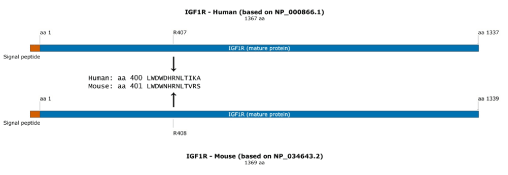 Supplemental Figure 1. Schematic of human and mouse IGF1R protein. A protein schematic showing the different lengths of mouse and human IGF1R, with the mouse arginine at position 408 corresponding to the human arginine at position 407