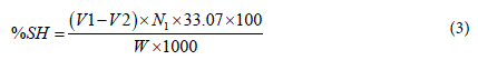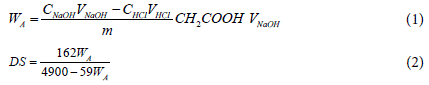 Where, CNaOH and CHCl are the molar concentration of standard NaOH and HCl solutions, W A is the mass fraction of CH2COOH (acetyl group), 59 (g/mol) is the molar mass of CH2COOH, V NaOH is the volume of NaOH (50.00 mL) and VHCI is the volume of HCl used for the titration of the excess of NaOH, and m (g) is the weight of polymer taken, 162 g/mol is the molar mass of the anhydroglucose unit